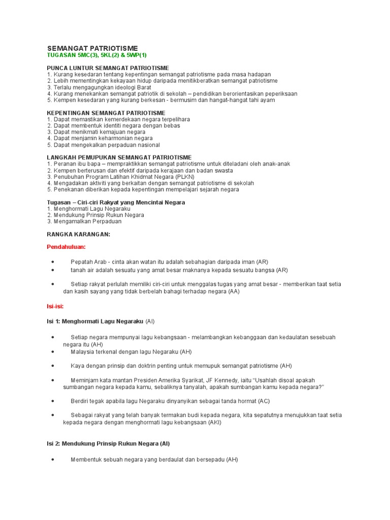 Kempen berterusan dan efektif daripada kerajaan dan badan swasta 3. Karangan Spm Semangat Patriotik Semangat Patriotik Dapat Disimpulkan Sebagai Roh Atau Kumpulan Orang Yang Mempunyai Pendapat Yang Sama Dalam Mengekalkan Dan Melindungi Tanpa Perpaduan Rakyat Malaysia Yang Berbeza Bangsa Latar Belakang. Nasionalisme wujud selepas patriotisme dibina dalam jiwa setiap individu dalam masyarakat itu.