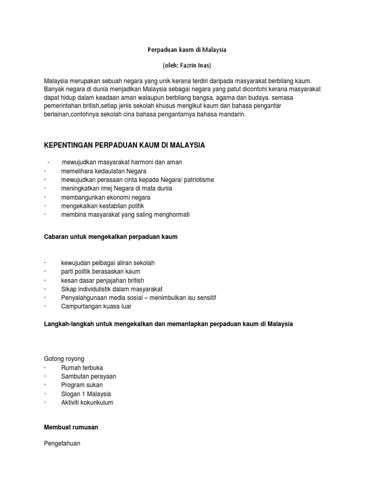 Perpaduan Kaum Di Malaysia Pdf