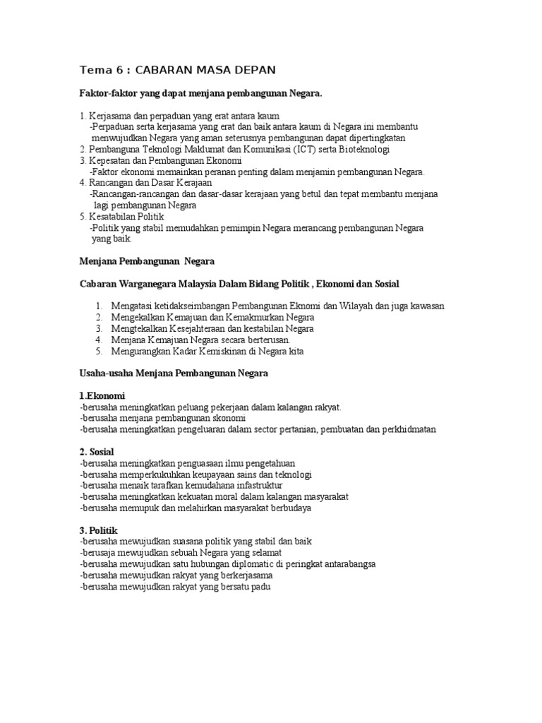 Tema 6Cabaran Masa Depan Kepentingan Mengekalkan Keamanan Negara. Memberikan penjelasan tentang budaya kerja cemerlang. Keburukan globalisasi kepada negara kita ialah meningkatkan jurang perbezaan antara bandar dengan luar bandar.