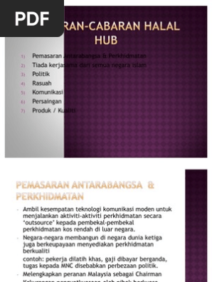 Cabaran hab halal di malaysia. USAHA MEMAJUKAN HAB HALAL. KUALA LUMPUR Hasrat Malaysia untuk menjadi hab halal dunia menjelang 2020 semakin cerah apabila tiga buah negara besar telah menunjukkan minat dan sedia bekerjasama dengan kerajaan untuk merealisasikan impian itu. Memanfaatkan pengalaman Malaysia dalam membangunkan industri Halal.